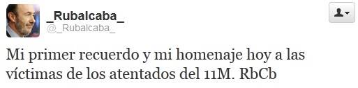 El secretario general del PSOE, Alfredo Pérez Rubalcaba, ha querido hoy trasladar, a través de su cuenta en Twitter, un "primer homenaje y recuerdo" a las víctimas de los atentados del 11 de marzo.