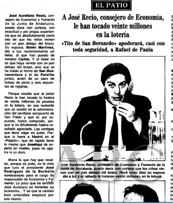 Dicen que le ha tocado la lotería varias veces. Qué suerte. Cuenta Santiago González que "hace ya bastantes años...se conoció la circunstancia de que el entonces consejero de la Junta de Andalucía y posteriormente socio de Carlos Solchaga, José Aureliano Recio, ‘Pepe Recio’ en el mundo del arte, fue agraciado dos veces en la lotería, ambas en coincidencia con el nacimiento de sus dos hijos. Contaba Cambio 16 que una vez le tocaron 30 millones de pesetas y la otra, 20 (de las de entonces). También contaba que los andaluces le habían sacado una copla conmemorativa: "La potra de Recio/ no tiene precio./ Que el señor consejero/ cada vez que la mete/ saca dinero".)