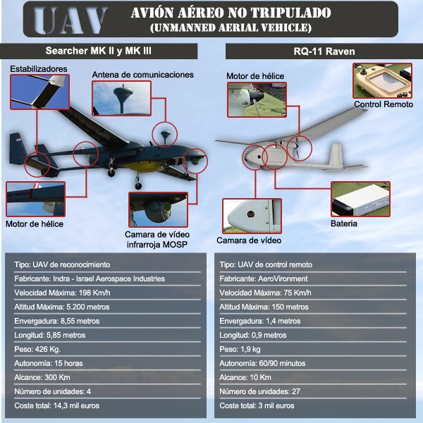 En la actualidad, existen dos modelos de UAV desplegados por España en Afganistán. Por un lado, los Searcher MK, fabricados en colaboración por EADS e Indra, bajo licencia de la empresa Israel Aerospace Industries (IAI). Se trata de una unidad de tamaño medio, con una envergadura de 8,5 metros, de los que se adquirieron cuatro unidades en 2007 por un precio de más de 14 millones de euros. Tras ser derribado uno de ellos por los talibanes, se adquirió otra unidad en septiembre de 2009 por algo más de cinco millones de euros.
