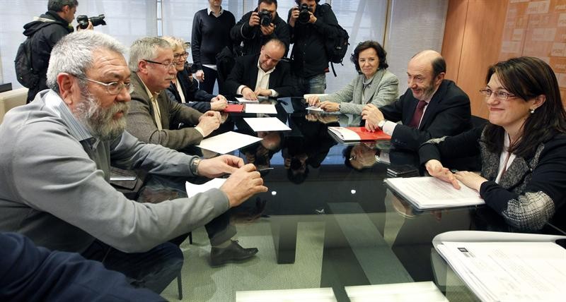 Tras una reunión con el secretario general del PSOE, Cándido Méndez e Ignacio Fernández Toxo, líderes de UGT y CCOO respectivamente, han comparecido ante los medios para proclamar que hay "otras alternativas" para salir de la crisis y arremeter contra los recortes de Rajoy.