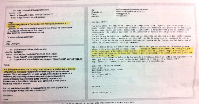Pues bien, dos semanas después, el diario El País se hace eco de la misma información, pero, esta vez, aporta una copia de los correos electrónicos. En concreto, publica tres de los correos electrónicos que el abogado de Diego Torres –ex socio de Urdangarín y principal imputado, junto a su esposa, por el caso Nóos- entregó en el juzgado y que han sido incorporados en el sumario. Correos en los que se puede ver, incluso, las direcciones de correo electrónico del Duque de Palma y su socio, además de las direcciones de correo electrónico de Pedro Perelló o Jorge Forteza.