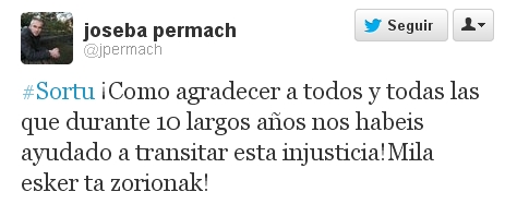 Otro miembro de la cúpula dirigente de Batasuna-ETA, Joseba Permach, quiso festejar en las redes sociales la sentencia: "¡Cómo agradecer a todos y todas las que durante 10 años largos nos habéis ayudado a transitar esta injusticia! Mila ezker ta zorionak (Muchas gracias y felicidades)".