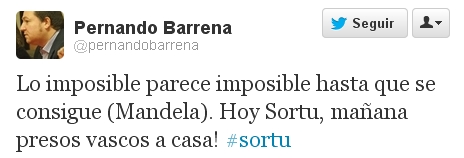 En esta línea, insistía poco después, parafraseando incluso al ex presidente sudafricano Nelson Mandela: "Lo imposible parece imposible hasta que se consigue (Mandela). ¡Hoy Sortu, mañana los presos de ETA a casa!".