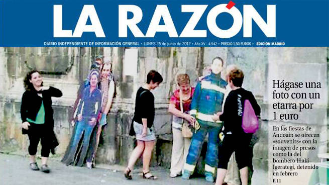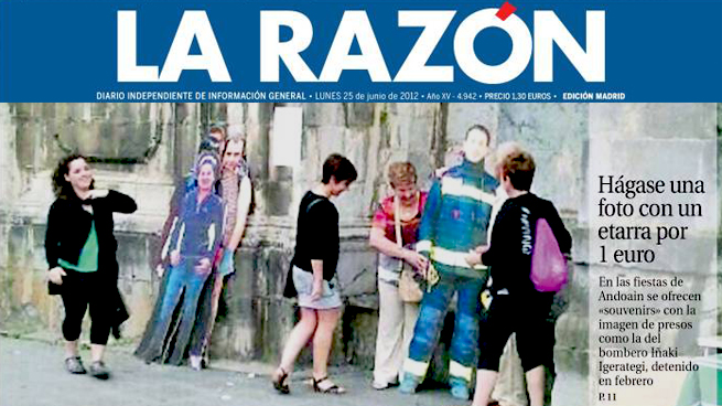 Simpatizantes de ETA ofrecieron el pasado sábado a los vecinos de Andoain (Guipúzcoa) hacerse una fotografía junto a imágenes a tamaño natural de presos de ETA de la localidad a cambio de un euro para recabar fondos en apoyo a los reclusos, según informa este lunes La Razón.