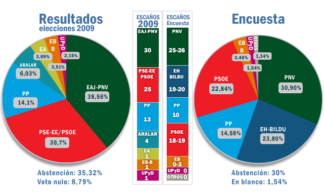 Así, la formación nacionalista obtendría un 30% de los votos y 25 ó 26 escaños; mientras que la lista proetarra, ya sea esta Bildu o Sortu, se convertiría en el segundo partido de la cámara vasca, acercándose a un 24% de los votos y alcanzando 19 ó 20 representantes en la cámara de Vitoria.