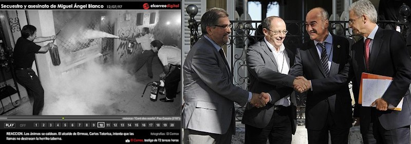 En la primera imagen, Totorica (izquierda) apaga el fuego de una herriko. En la segunda, el alcalde de Ermua se saluda con Eguiguren, Izaguirre y Garitano