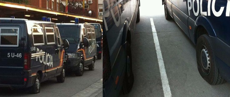 Este jueves, el complejo policial de Moratalaz, donde se encuentra establecida esta unidad, ha amanecido con al menos sesenta furgonetas UIP con las ruedas rajadas, y muchas de ellas deberían estar en funcionamiento para el dispositivo de seguridad que se llevará a cabo para la manifestación contra los recortes que se celebra por la tarde.