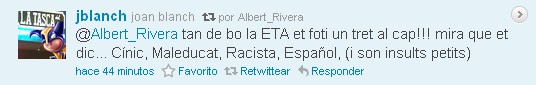 En la página de Albert Rivera en la red social Twitter ha aparecido este domingo un mensaje de un tal Joan Blanch, que va más allá de los habituales insultos que el líder de Ciudadanos tiene que aguantar con frecuencia.