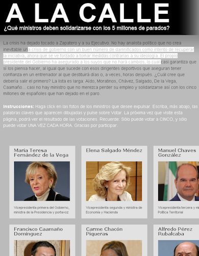 Ante los recientes rumores de crisis de Gobierno, Libertad Digital quiere ayudar al presidente a renovar su desgastada Ejecutiva. "A la calle" brinda la oportunidad a los lectores para decidir a quién echarían a la calle y por qué orden. Todo un medidor de la labor de unos ministros que han sido responsables de la pérdida de empleo de cinco millones de españoles.