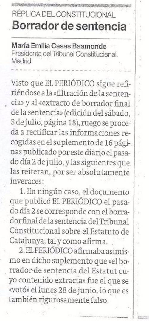 En la carta, María Emilia Casas señala que "en ningún caso" el documento que ha publicado El Periódico se corresponde con el borrador final de la sentencia, así como que es "rigurosamente falso" que fuera el texto que se votase en el Pleno del pasado 28 de junio, donde el Alto Tribunal avaló la mayor parte de la norma estatutaria catalana.