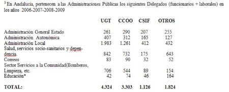 Si se tiene en cuenta que, según el informe del secretario general de Comisiones Obreras de Andalucía, Francisco Carbonero, "los resultados de las Elecciones Sindicales a 31 de diciembre de 2007, como fecha de terminación del proceso de mayor concentración electoral, nos dicen que CCOO ha aumentado su representatividad, ampliando el número total de delegados y delegadas de personal elegidos a 18.485 (2.805 más que en diciembre de 2003) y reduciendo la diferencia con UGT en 103 delegados y delegadas a la citada fecha, que es la menor de los tres últimos procesos electorales", entonces podemos adjudicar a CCOO 18.485 y a UGT 18.588, 103 más, haciendo un total de 37.073 delegados de personal , de los que casi una tercera parte la componen los delegados de la Administración Pública andaluza, lo que da una idea del poder interno de las Federaciones de Servicios Públicos o de la Administración en las organizaciones sindicales.