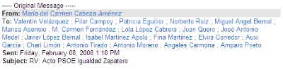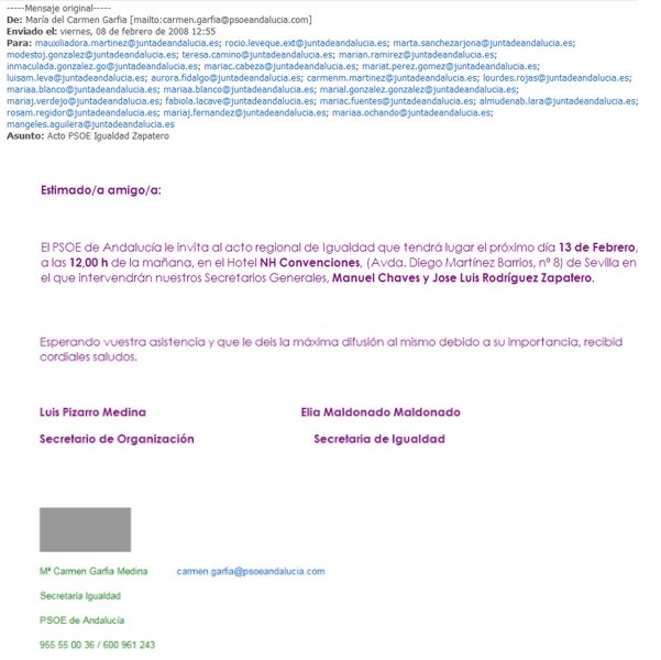 Concretamente, Maria del Carmen Garfia, secretaria de Igualdad de PSOE, a las 12:55 del día 8 de febrero, día hábil y en horario laboral, remitió a la Consejería de Economía y Hacienda la invitación al acto que va a celebrar mañana, día 13 de febrero, el Partido Socialista, con la presencia de Manuel Chaves y el Presidente del Gobierno, José Luis Rodríguez Zapatero en el hotel NH Convenciones de Sevilla. En este caso, el e-mail fue remitido desde el PSOE a la secretaria de la Directora General de Planificación de la Consejería de Economía, Patricia Eguilior Arranz.