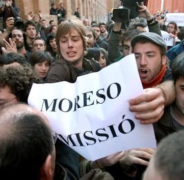 Agentes de los Mossos d'Esquadra vestidos de paisano lograron proteger al presidente, así como al resto de autoridades que abandonaron el campus. Mientras, una cincuentena de estudiantes anti Bolonia coreaban consignas como "Moreso dimisión", "Fuera los Mossos de la Universidad" y "Somos estudiantes, no delincuentes".
