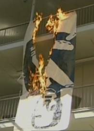 LD (Europa Press) Cuatro encapuchados quemaron este viernes una pancarta de más de tres metros de altura con un retrato del Rey durante una concentraron en la Facultad de Física de la Universidad de Barcelona (UB) para expresar su solidaridad con los imputados por la quema de fotografías del Rey Juan Carlos I.