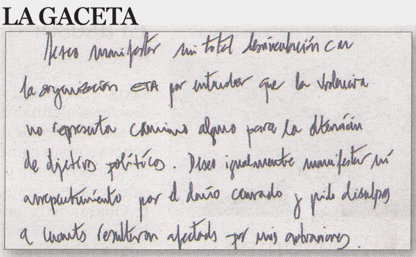 Otra de las cartas, que sigue el mismo patrón, dice lo siguiente: "Por la presente anuncio mi abandono de la lucha armada, mi arrepentimiento por los delitos cometidos dentro de la organización ETA, mi perdón a las víctimas causadas, así como mi intención de hacer frente a la indemnización que me corresponde".
