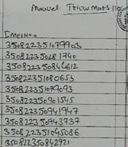 - En este estado de la presente, el Instructor dispone informar al declarante de que, entre esos doscientos IMEIS, han de figurar dos en concreto, los números 350822350941947, y 350822350844612, de especial interés para el curso de la investigación. PREGUNTADO sobre dichos números, CONTESTA, tras consultar la relación, que, efectivamente, figuran ambos."