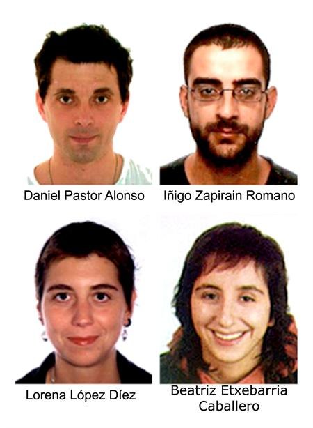 En la capital vizcaína fueron arrestados tres de ellos. Exactamente, la pareja conformada por Iñigo Zapirain Romano, de 34 años, y Beatriz Etxebarría Caballero, de 33 años de edad; y Lorena López Díez, de 31 años. El cuarto detenido, en la localidad de la comarca del Gran Bilbao, fue Daniel Pastor Alonso, de 37 años. Ninguno de los cuatro contaba con ningún tipo de antecedente penal.