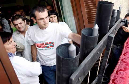 Bizkai ha prendido la mecha del cohete flanqueado por sus dos compañeras de candidatura, vestidos los tres con una camiseta con la bandera navarra y la ikurriña y con el lema "geureak independentzia", mientras en la plaza bajo el balcón consistorial se congregaba numerosas personas, entre ellas un grupo con caretas blancas que mostraban fotos de presos de ETA.