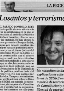 (Libertad Digital) Tras la denuncia de la publicación de una viñeta en la que se tachaba a Jiménez Losantos y a la AVT de "verdaderos terroristas", el diario Segre ha publicado este miércoles una rectificación, una disculpa de los propios viñetistas, además de una columna de opinión de su director. En esta última, Juan Cal señala que "para que nadie albergue dudas, vayan por delante nuestras disculpas hacia el periodista turolense y las víctimas del terrorismo". Los autores, Lumaca & Facallós, apuntan que tan sólo "planteamos una reflexión entre interrogantes, a modo de crítica política".