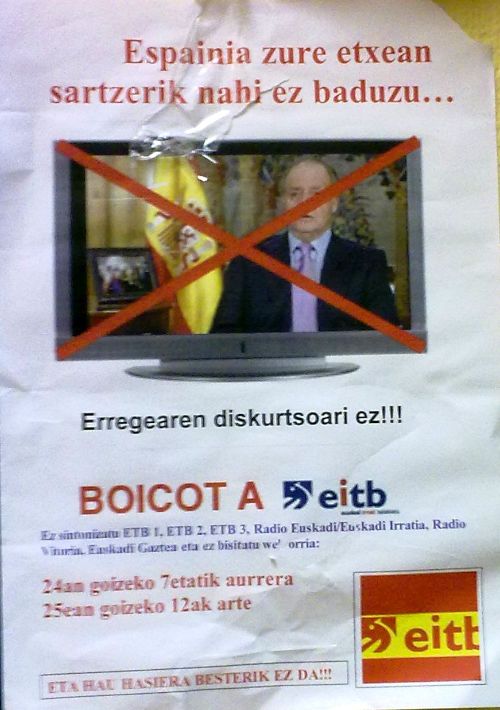El cartel, en el que aparece un fotograma de uno de los mensajes navideños del Rey tachado, estaba encabezado por un mensaje en euskera que se traduce como "Si no quieres que España entre en tu casa... no al discurso del Rey. Boicot a ETB. No sintonices ETB 1, ETB 2, ETB 3, ETB, Radio Euskadi/Euskadi Irratia, Radio Vitoria, Euskadi Gaztea, y no visites sus páginas web".