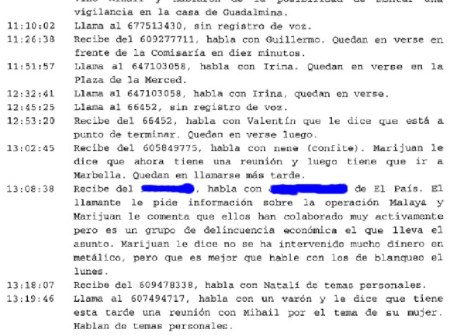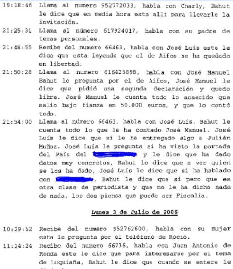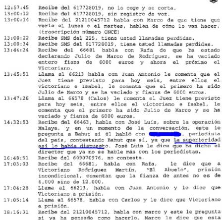 Estas conversaciones fueron grabadas por policías a policías, y es de suponer que ninguno de los comisarios implicados supiera que estaban siendo "escuchados" por terceros. Por eso, se supone veracidad a lo que dicen. A lo largo de más de dos decenas de folios aparecen hasta seis periodistas distintos del diario emblemático de Prisa. Estos periodistas disponen de los teléfonos particulares de los comisarios Bahut y Marijuán, a los que llaman. Recuérdese que el caso Malaya estaba por entonces bajo el secreto del sumario decretado por el juez Torres. Evidentemente los periodistas tienen la obligación de obtener la información que puedan, pero es menester señalar que su acceso a la misma por órdenes de la "superioridad" o su acceso a datos detallados de alguna investigación al margen de todo conducto oficial hace sospechar sobre un trato de favor entre el medio de Prisa y los ministerios implicados.