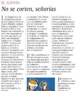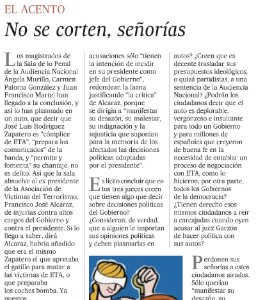 En su sección de análisis "El Acento", el diario de Prisa dice que de haber conocido lo que el auto de los magistrados diría, Alcaraz hubiera podido apuntar también que "era el mismo Zapatero el que apretaba el gatillo para matar a las víctimas de ETA o que preparaba los coches bomba".