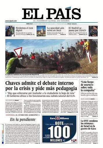 Desde la primera línea a la última, el editorial que este miércoles de El País no deja de azotar con dureza a Zapatero, personalizando además en el presidente del Gobierno (y no en el Consejo de Ministros o el PSOE) su demoledora crítica. Así, empieza señalando que Zapatero "atraviesa uno de los momentos políticos más difíciles desde su llegada a La Moncloa" y termina hablando de "confusión sin precedentes" en asuntos de gran trascendencia como una crisis que "nos acompañará aún mucho tiempo".
