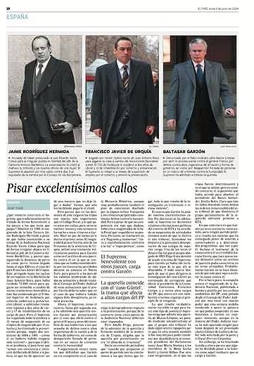 El primero llama la atención por su extensión, más de media página de apretada escritura, y por su presentación a plana completa con fotos del propio Garzón y de dos magistrados juzgados por el Supremo y con condenas muy suaves a juicio del autor. También es llamativo el título elegido: "Pisar excelentísimos callos".
