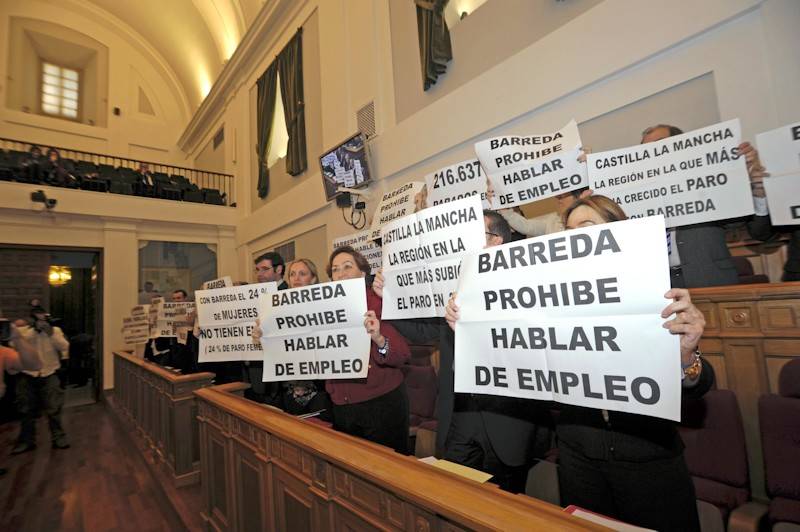 Así las cosas, los diputados del PP optaron por protestar ya iniciada la sesión y mostraron folios impresos en los que se mostraba la negativa de Barreda a debatir sobre el empleo. Acto y seguido, el pleno se suspendió temporalmente y se convocó una reunión urgente de la Mesa para volver a debatir la solicitud popular.