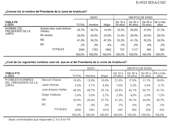 Curiosamente, cuando se preguntó a los andaluces por el presidente de la Junta, José Antonio Griñán, menos de la mitad saben quièn es y si es presidente de la Junta, lo que subraya un serio problema de imagen en el candidato socialista. De hecho, sólo el 28,7% de los encuestas acierta con el nombre cuando se le pregunta a la gente por nombre del Presidente de la Junta. Y aunque el 48, 7 por ciento lo detecta como presidente de la Junta, aún queda más de la mitad de los andaluces que o bien cree que el presidente es Chaves, Arenas, Valderas o no sabe.