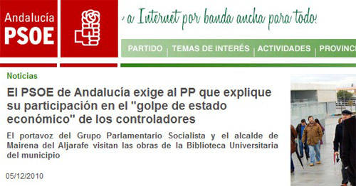 En la publicación del pasado día 5 de diciembre, de la que se hizo eco LD, Mario Jiménez habla con toda claridad de "golpe de estado económico" y acusa al PP de haber participado en un supuesto "golpe" que habría urdido junto con los controladores de aeropuertos. La grave acusación sigue colgada, varios días después en la página web del PSOE-A, en un lugar destacado y por encima de artículos más recientes . Incluso los usuarios tienen la opción de descargarse el audio.