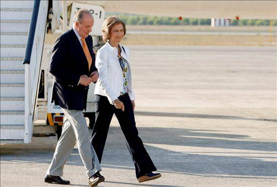 Don Juan Carlos y Doña Sofía han aterrizado en la base militar del Aeropuerto de Palma procedentes de su viaje oficial en las Islas Madeira a las 19.31 minutos, sólo un minuto más tarde de lo previsto. El Rey fue el primero en salir del avión vestido de traje y corbata y segundos más tarde lo hizo la Reina, quien vestía unos pantalones negros, una chaqueta blanca y una blusa estampada de flores de colores, si bien ambos bajaron juntos las escaleras hacia las instalaciones militares del aeródromo, donde les esperaba el jefe de la base aérea.