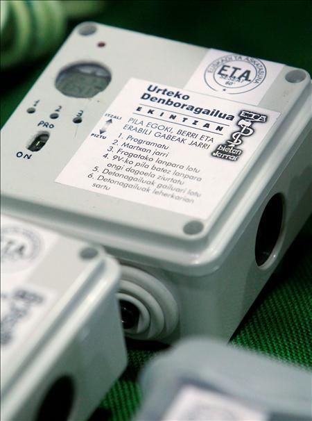 Además del centenar de kilos de sustancias para fabricar explosivos, entre los objetos descubiertos en el garaje de Villabona registrado, había 8 detonadores bien colocados en "tuppers" y 10 dispositivos de iniciación temporizada, los 18 perfectamente identificados como propiedad de ETA con pegatinas que incluían tanto el anagrama de la serpiente con el "bietan jarrai" como el sello circular que los terroristas usan en comunicados y cartas de extorsión.