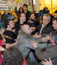 De esta forma, arropada por dirigentes del PPdeG que habían asistido a la conferencia, volvió a encontrarse con los estudiantes que pretendían boicotear su acto y se reprodujeron los enfrentamientos con los escoltas. La Policía Nacional decidió reforzar la seguridad y trasladó a la Facultad tres coches policiales con agentes para escoltar la salida de la presidenta del PP vasco, pero sólo tuvo que separar a algunos jóvenes que empujaba y se lanzaban contra el grupo de personas que acompañaba a la política popular, que abandonó a pie las instalaciones docentes.
