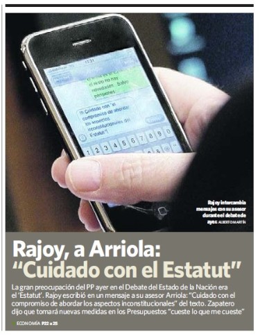 El Economista captó este miércoles el contenido de un mensaje enviado por Mariano Rajoy a su asesor Pedro Arriola en el fragor del Debate sobre el estado de la Nación. Su contenido se refería al Estatuto catalán y, en concreto, a la promesa hecha por José Luis Rodríguez Zapatero de hacer cambios legales que hagan encajar los aspectos declarados inconstitucionales en la Carta Magna, saltándose así el criterio de los magistrados.