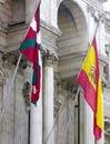L D (Agencias) Con la española, el resto de banderas ondearon en el Ayuntamiento hasta las nueve de la mañana, cuando los policías municipales las retiraron de los mástiles. En el momento de colocar las enseñas, un reducido grupo de jóvenes que se encontraba junto al edificio consistorial comenzó a emitir pitidos y a corear consignas como "ikurriña sí, española no", "Azkuna español" o "Tenemos un alcalde que es un facha".