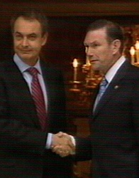 Y así fue. Con la insignia nacional a la izquierda y la bandera vasca a la derecha, el presidente Zapatero esperaba al lehendakari Ibarretxe a pie de escalinatas. El cielo era oscuro, la misma tonalidad que eligieron ambos mandatarios para sus trajes. Divergieron, eso sí, en el color de sus corbatas dentro de la citada oscuridad. Zapatero la prefirió roja e Ibarretxe azul.