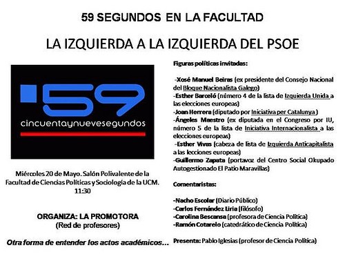 (Libertad Digital) El mitin fue este miércoles bajo el título "La izquierda a la izquierda del PSOE" y lo presentaron como "59 segundos en la facultad". Los invitados eran el antiguo líder del nacionalismo gallego, Xosé Manuel Beiras; el diputado comunista-verde Joan Herrera; una señora de Izquierda Unida que se llama Esther Barceló, y ocupa el número cuatro en la lista de los comunistas para las Elecciones Europeas; la ex dirigente de IU, Ángeles Maestro, número 5 en la lista Iniciativa Internacionalista, que está siendo investigada por su posible relación con el entorno de la ETA; Esher Vives, que es la cabeza de lista de Izquierda Anticapitalista y Guillermo Zapata que es okupa.