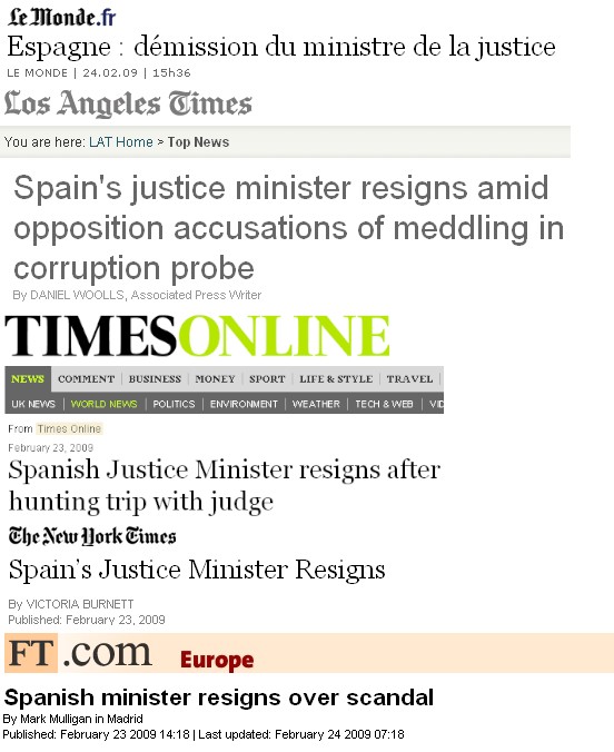 (Libertad Digital) Han sido numerosos los diarios extranjeros que se han hecho eco de la dimisión presentada este lunes por el ministro de Justicia Mariano Fernández Bermejo, presionado por el escándalo de su cacería, cena y fin de semana con el Juez Baltasar Garzón, justo los días en que el magistrado abrió una causa para implicar a numerosos miembros del PP en un supuesto escándalo de corrupción.