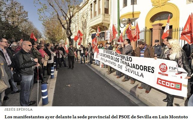La diferencia con las manifestaciones de los funcionarios y laborales de la Junta es que, en este caso y por ahora, Comisiones Obreras y UGT apoyan las peticiones laborales de estos funcionarios municipales. Manuel Gutiérrez Fuentes, secretario general de CC.OO. explicó a ABC los motivos de esta protesta, otra de las que vienen protagonizando los jueves desde el pasado septiembre y con las que seguirán, aseguran, hasta las elecciones «Los trabajadores municipales denunciamos el desvío de tres millones de euros del capítulo de Personal de los Presupuestos Municipales, a Lipassam, Tussam y la Televisión Local (Giralda TV) —sociedades de la Agrupación de Interés Económico municipal que financiará la campaña de Monteseirín— en detrimento de las plazas que se quedan sin cubrir y que según calculó llegan al 10% de toda la plantilla».