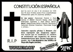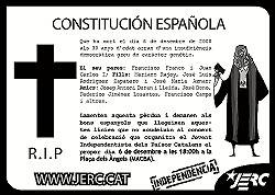Dentro del presunto tono de humor del anuncio – esquela, los "padres", "hijos" y "amigos" de la Constitución piden a los jóvenes que no vayan a la celebración "organizada por el Joven Independista de los Países Catalanes" y que, tal y como anuncian en su página web, contará con la actuación de cuatro grupos musicales distintos y la presencia estelar del Gerard Coca, portavoz de las JERC y de Joan Tardà, diputado del partido independentista en el Congreso Madrid.
