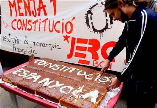 Las juventudes de Esquerra Republicana de Cataluña (JERC) protagonizaron este sábado un nuevo acto contra la Constitución Española, consistente en comerse y repartir entre los transeúntes un pastel que simbolizaba la Carta Magna.