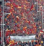 ![Más de 100.000 personas advierten al Gobierno en Pamplona que "Navarra es España" Más de 100.000 personas [103.000, según el Gobierno foral] han salido este sábado al centro de Pamplona para exigir claridad moral y política de firmeza al Gobierno contra el chantaje terrorista. La manifestación por "la libertad y el fuero" se desarrolló con ejemplar civismo y seguida de un mosaico de banderas de España y Navarra. Encabezaron la marcha el presidente de Navarra, Miguel Sanz, y el del PP, Mariano Rajoy. Lemas como Navarra no se vende, o Navarra es España se corearon durante todo el recorrido. El secretario general del PP, Ángel Acebes, resumió el compromiso de su organización con la causa del fuero navarro: "Si Batasuna-ETA dijo que, sin Navarra, nada, nada, el PP está aquí para recordar que con Navarra, todos, todos".](https://s1.staticld.com/images/trans.png)