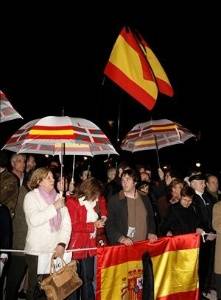 Centenares de ciudadanos acudieron a la llamada del Foro de Ermua para manifestar su repulsa por el último atentado perpetrado por la organización terrorista y se concentraron tras una pancarta con el lema "Por la libertad. Derrotemos juntos a ETA", acompañados de multitud de banderas de España con crespones negros y con mensajes contra ETA y el Gobierno.