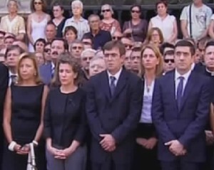 Concentraciones en los ayuntamientosPor la mañana se celebraron concentraciones silenciosas a las 12:00 horas ante las casas consistoriales e instituciones de toda España. Los trabajadores que este viernes permanecían en el Congreso y el Senado, en plenas vacaciones parlamentarias, han salido a las puertas de ambas instituciones para expresar su rechazo por el atentado cometidopor ETA en Mallorca y rendir homenaje a los dos guardias civiles asesinados en esta acción terrorista.