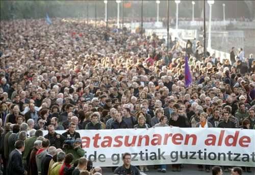 Miles de personas se manifestaron, desde poco después de las cinco de la tarde, por las calles de San Sebastián en respuesta a la convocatoria de ELA, LAB, ESK, STEE-EILAS, EHNE e HIRU para protestar por las detenciones practicadas en la operación del pasado 13 de octubre contra la nueva dirección de Batasuna-ETA.