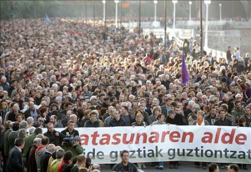 Los manifestantes partieron pasadas las cinco de la tarde del túnel de Ondarreta en la capital guipuzcoana, tras una pancarta portada por los secretarios generales de las centrales convocantes, en un ambiente soleado aunque marcado por las bajas temperaturas, coreando consignas en las que se pedía la libertad para los proetarras detenidos.