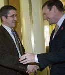 (Libertad Digital) En las octavillas repartidas por Nuevas Generaciones aparecía una fotografía de Ibarretxe y Patxi López sonrientes. El texto que la acompañaba se preguntaba "¿De qué se ríe López?" y daba la contestación: "Patxi López se ríe de los vascos. Su apoyo a los Presupuestos se traducen en: PNV+PSE= Plan Ibarretxe".