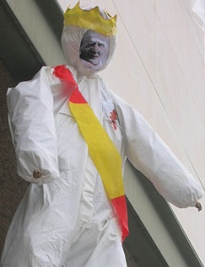 Por su parte, dos jóvenes vestidos con un mono blanco y el rostro cubierto han desplegado desde el techo de un edificio de la universidad una gran pancarta en la que podía leerse "La UAB también quema la corona española" y han colgado un muñeco hecho a mano ataviado con una corona, una bandera española a modo de banda y la cara del Rey.