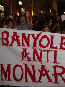 Unas 300 personas se reunieron y mostraron una pancarta en la que se podía leer: "Yo también quemo la bandera española" y "Banyoles antimonárquica". Uno de los participantes en el acto leyó un manifiesto y al finalizar la lectura todos los simpatizantes reunidos en la plaza quemaron una hoja con la imagen de los monarcas españoles. A la concentración no asistió Jaume Roure.